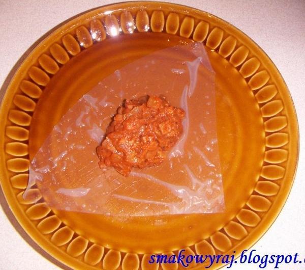 Sajgonko – krokieciki zaczęłam robić już pewien czas temu. Potrzebowałam wtedy szybki pomysł na ciepłą kolację. Przeszukałam lodówkę i szafki w kuchni, no i znalazłam papier ryżowy. Pomyślałam, może krokieciki? I od tego czasu papier ryżowy stał się dla mnie zamiennikiem naleśników przy wyrobie krokietów :) oczywiście robię też takie tradycyjne krokiety, na które w najbliższej przyszłości dodam przepis. A tymczasem krokieciki sajgonkowe :)Farsz:1 puszka białej fasolki1 duża cebula3 łyżki przecieru pomidorowego1 ząbek czosnku3 kawałki kiełbasy śląskiej½ łyżeczki pieprzu CayenneSólPieprz czarny30g margarynyDodatkowo:Ok.15 listków papieru ryżowego (w zależności od wielkości)1 jajkoBułka tartaOlej lub tłuszcz do smażeniaKiełbasę i cebulę obieramy, kroimy w kosteczki. Margarynę rozpuszczamy, dodajemy cebulkę z kiełbasą. Dusimy chwile pod przykryciem. Następnie dodajemy pół szklanki wody, przeciśnięty czosnek i przecier pomidorowy. Z fasolki wylewamy zalewę, wysypujemy ją na talerz i miażdżymy widelcem, tak by powstała papkowata masa. Dodajemy ją do reszty farszu i przyprawiamy pieprzem Cayenne, solą i czarnym pieprzem. Po zagotowaniu masa powinna być gęsta. Jeśli jest zbyt rzadka dodajemy rozmieszaną mąkę z wodą (pół szklanki wody mieszamy z czubatą łyżką mąki) i zagotowujemy. Jeszcze raz próbujemy i ewentualnie doprawiamy do smaku.Listki papieru ryżowego pojedynczo moczymy po kilka sekund w niewielkiej ilości wody, tak aby zmiękły. Gdy listek jest miękki od razu kładziemy go na oddzielnym talerzu lub desce, dodajemy farsz i składamy jak kopertę, czy krokieta tzn. lewy bok, prawy bok, tył i na koniec przód.