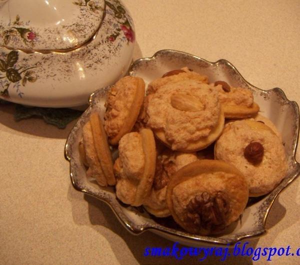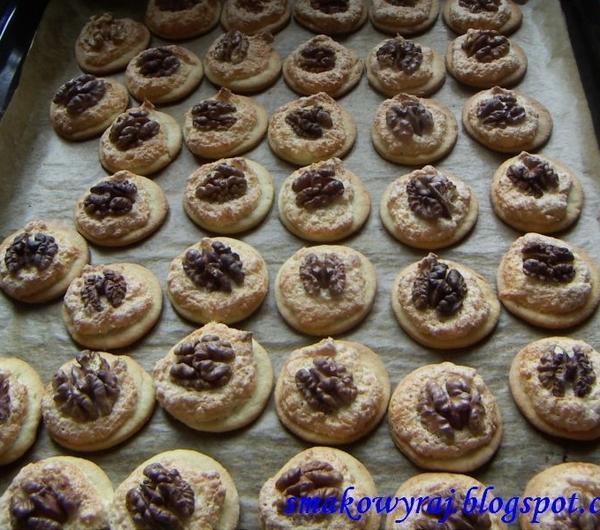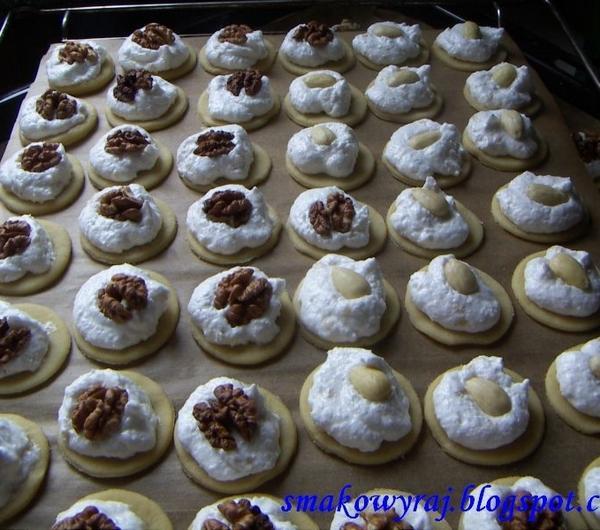 Ciasteczka kosmiczne wypiekam od kilku lat. Przepis jest na dość dużą ilość ciasteczek, więc jeśli ktoś woli, może zrobić z połowy porcji. Ja osobiście polecam zrobienie z całej porcji, gdyż można je dość długo przechowywać i są pyszne :)Ciasteczka:250g margaryny60dag mąki (+ szklanka do podsypania)15 cukru1 opakowanie cukru waniliowego3 łyżki kwaśnej śmietany3 jajka1 łyżeczka proszku do pieczeniaMasa kokosowa:4 białka1 ½ szklanki cukru pudru200g kokosuOkoło 30-40dag połówek orzechów włoskich, migdałów, orzechów laskowychMiękką margarynę ucieramy z cukrem, cukrem waniliowym, śmietaną, jajkami i proszkiem do pieczenia. Na koniec wsypujemy mąkę, wyrabiając ciasto. Masę ciastową wałkujemy na grubość 3-5mm, z której wykrawamy ciasteczka. Gotowe ciasteczka układamy na blaszkach wyłożonych papierem pergaminem.Z białek ubijamy sztywną masę, następnie wsypujemy cukier i ubijamy jeszcze chwilę. Na koniec do masy dodajemy kokos i mieszamy łyżka. Gotową masę przekładamy do szprycy lub woreczka i pokrywamy nią ciasteczka. Na koniec układamy orzechy i migdały na ciasteczkach.