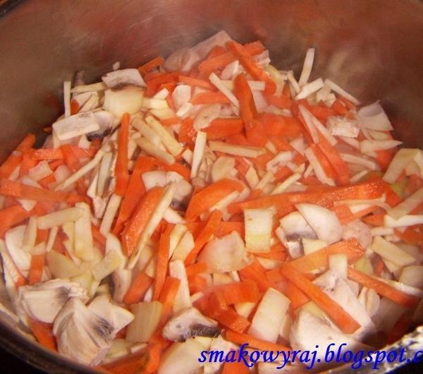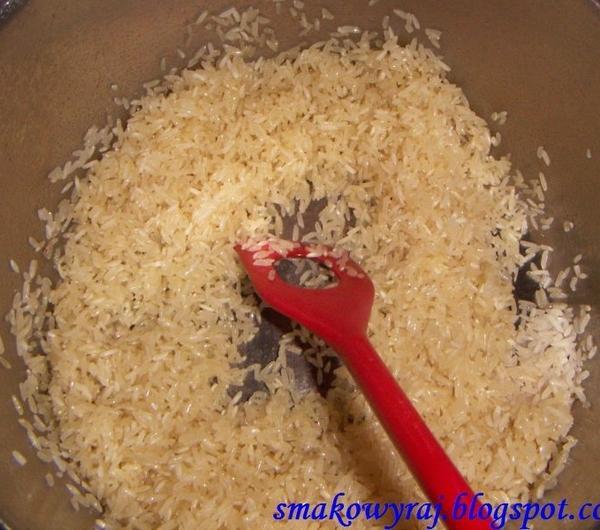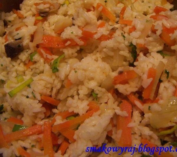 Margarynę rozpuszczamy w garnku, następnie wsypujemy ryż i podsmażamy mieszając przez około 3 minuty. Następnie zdejmujemy garnek z ognia i dodajemy kostkę bulionową i sól. Całość zalewamy wodą, przykrywamy pokrywką i dusimy około 10-15 minut na bardzo wolnym ogniu, co pewien czas mieszając. Z czasem woda wyparuje, ale nie dodajemy jej więcej, gdyż ryż ma mieć konsystencje raczej sypką i niż mokrą, czy papkowatą. Czas gotowania zależy od twardości ryżu. Najlepiej po 10 minutach sprawdzić, czy jest wystarczająco miękki. Należy też zwrócić uwagę na kleistość ryżu. Jeśli jest zbyt lepki, dobrze go po uduszeniu pozostawić bez przykrycia na pewien czas, np. na czas duszenia jarzyn :)W osobnym garnku rozpuszczamy margarynę, wsypujemy pokroje drobno jarzyny. Marchew, pietruszkę, seler koimy w paski grubości około 3-5mm. Dusimy na wolnym ogniu, pod przykryciem, co pewien czas mieszając, do czasu aż marchewka będzie miękka, czyli około 5 minut.