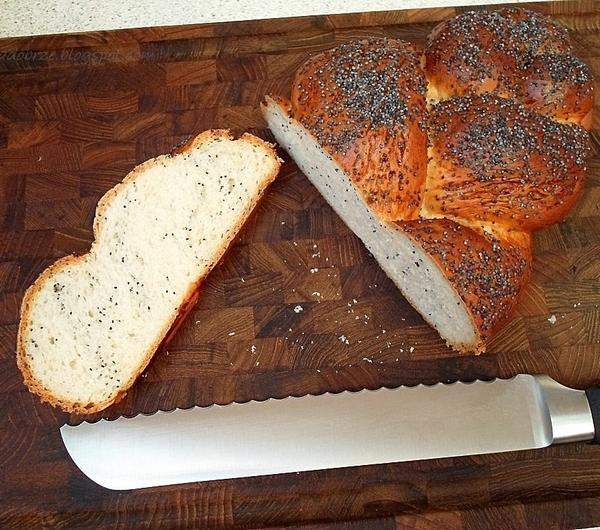 mak, dokładnie wgnieść w ciasto.Ciasto podzielić na 3 równe części, z każdej uformować wałeczek długości 25-30 cm. Zapleść