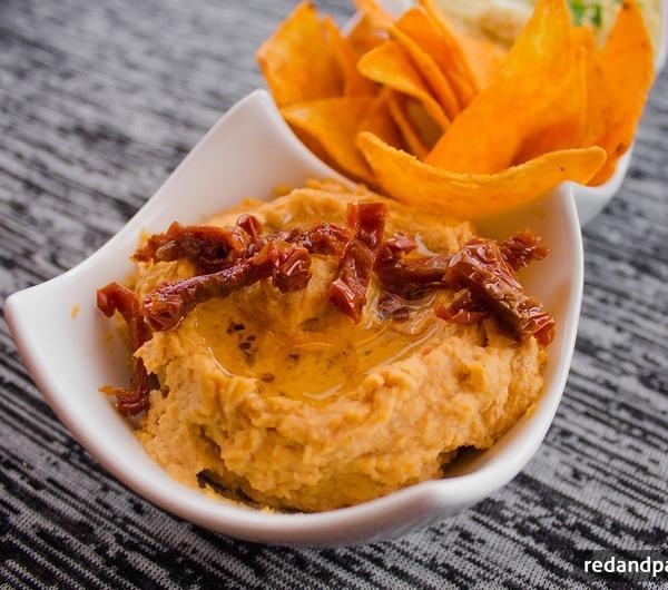 składniki:- 1 puszka ciecierzycy- 1⁄3 szklanki tahini (pasty sezamowej)- 4 łyżki oleju z suszonych pomidorów z przyprawami- 4 suszone pomidory + 1 do posypania- 1 ząbek czosnku- sól i pieprz- ew. trochę zalewy z ciecierzycyCiecierzycę odsączyć (zachowując zalewę), przelać zimną wodą.Zmiksować z pastą sezamową, olejem, suszonymi pomidorami, czosnkiem i przyprawami.Jeśli masa jest za sucha, można dodać trochę zalewy z ciecierzycy lub więcej oleju.Podawać polaną olejem z pomidorów i posypaną kawałkami pomidorów.