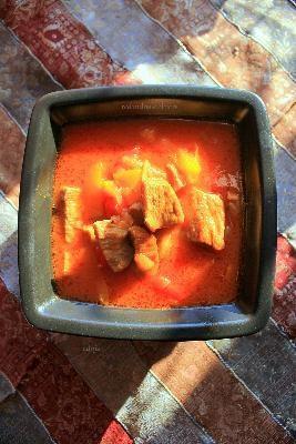 składniki na 4 porcje:- ok. 80 dkg cielęciny (u nas polędwica)- 5 łyżek oleju- 2 cebule- 1 łyżka mąki- 1 szkl białego, wytrawnego wina- 3 szkl soku pomidorowego- 3 ząbki czosnku- 3 kolorowe papryki (u nas żółta, pomarańczowa i czerwona)- sól i pieprzW szybkowarze rozgrzać olej, cielęcinę pokroić w cienkie paski lub niedużą kostkę. Podsmażyć mięso do zrumienienia, w tym czasie posiekać cebulę, podsmażyć z mięsem. Posypać łyżką mąki (można sypnąć więcej, jeśli chce się uzyskać gęstą zupę) i wymieszać. Wlać wino i sok pomidorowy. Czosnek obrać i posiekać, wrzucić do garnka. Papryki umyć, wykroić gniazda nasienne, samą paprykę pokroić w paski, wrzucić do garnka, doprawić solą i pieprzem, przemieszać i szczelnie zamknąć szybkowar. Ustawić II stopień gotowania i gotować 20 minut od momentu przekroczenia progu ciśnienia wewnętrznego.