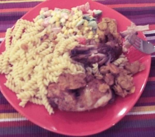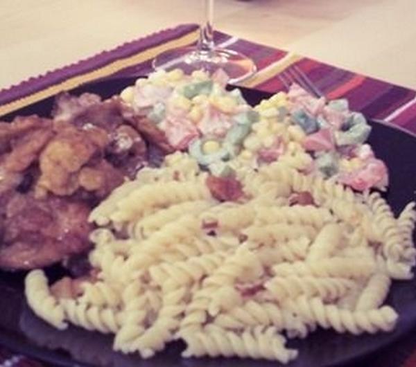 SAŁATKA REGGAEskładniki:- zielona papryka- mała puszka kukurydzy- kilka pomidorów- majonez- sól, pieprz, bazyliaPaprykę i pomidory pokroić w kostkę, kukurydzę odsączyć. Wymieszać wszystko, doprawić przyprawami, dodać kilka łyżek majonezu, jeszcze raz dokładnie wymieszać.Do tego wszystkiego oczywiście wino z Litchi, bo danie miało być typowo azjatyckie. Wino okazało się okropnie słodkie, ale dobre.