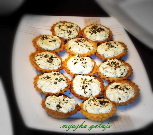Składniki :Ciasto :- margaryna 20 dkg- mąką 30 dkg- żółtka 4- sól 1/2 łyżeczkiKrem :- serek kanapkowy lekki o smaku ziołowym typu Almette- jogurt bałkański 70-100g- czosnek 1-2 ząbki ( opcjonalnie)- bazylia ( suszona) 2 łyżki- zioła prowansalskie 2 łyżki- sól, pieprz1. Zagnieść ciasto z podanych składników. Włożyć do zamrażalnika ( lub lodówki) na 30 minut.2. Wylepić foremki do babeczek ciastem, w taki sposób by pozostawić sporo miejsca na nadzienie.3. Włożyć do nagrzanego piekarnika do 180 stopni. Piec do czasu jak zaczną być lekko brązowe ( trzeba uważać, bo od czasu lekkiego zbrązowienia do spalenia mijają dosłownie sekundy).4. Serek miksujemy z jogurtem ( na początek lepiej dodać 70 g, jak będzie za gęsty dodać kolejne 30 g).5. Dodajemy czosnek przeciśnięty przez praskę ( czosnek można pominąć) oraz wszystkie przyprawy, doprawiamy solą i pieprzem i ponownie miksujemy.6. Gdy babeczki będą wystudzone napełniamy je farszem ziołowym.