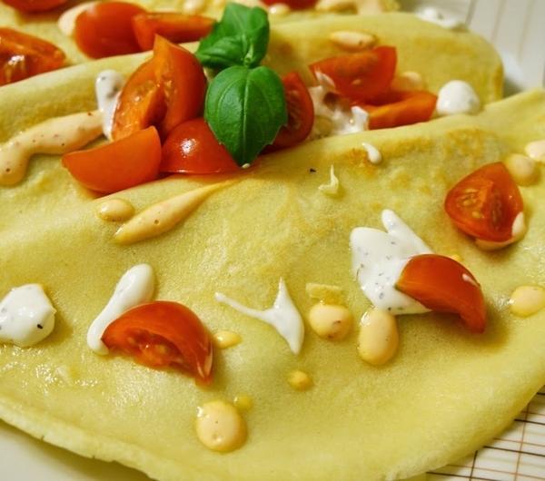 Składniki:4 jajka1/2 szklanki mleka 3,2%3/4 - 1 szklanki wody1 1/2 szklanki mąkiłyżka olejumozzarella ( nie z zalewy)szynka parmeńskaoliwki czarnepomidorki koktajloweoregano suszonebazylia suszonajogurt greckiczosnekpapryczka chiliPrzygotowanie :Przygotowuje ciasto na naleśniki : jajka , wodę, mleko, mąkę miksuje.Dodaję łyżkę oleju i ponownie miksuję.Rozgrzewam patelnię z odrobiną oleju i smażę naleśniki.Mozzarellę ścieram na tarce o grubych oczkach , szynkę kroję w paseczki, oliwki w plasterki.Na każdy naleśnik układam mozzarellę, szynkę i oliwki. Składam na pół i podgrzewam na patelni.Przygotowuje sosy : połowę jogurtu mieszam z czosnkiem przeciśniętym przez praskę, oregano i bazylią. Pozostały jogurt miksuję z papryczką chili.Pomidorki kroję.Podaję naleśniki, polane sosami i ułożonymi na nich pomidorkami.