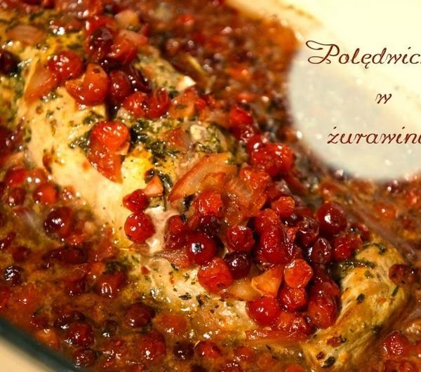 Część przepisu zaczerpnęłam z stąd - klik.Składniki :polędwiczka wieprzowa długa300 g mrożonej żurawiny ( żurawiny wcześniej nie rozmrażałam)1 duża cebula3 ząbki czosnku3 czubate łyżki płynnego miodu1/2 szklanki bulionu drobiowego1 łyżeczka octu balsamicznegochili w płatkach ( młynek)1 łyżka tymianku suszonego1 szczypta imbiru1 szczypta cynamonu1 szczypta szałwii1 szczypta rozmarynu1 szczypta estragonusólolejPrzygotowanie :Polędwiczkę w całości solę.Do miski wsypuje : chili, tymianek, imbir, cynamon, szałwię, rozmaryn, estragon i wlewam odrobinę oleju by uzyskać gęstą konsystencję. Mieszam.Nacieram mięso. Wkładam je do miski i skrapiam olejem.Cebulę i czosnek drobno siekam. Piekarnik rozgrzewam do 180 stopni.Obsmażam mięso na patelni , około 2-3 minuty z każdej strony.Zdejmuję mięso z patelni, i wkładam na nią cebulę i czosnek, smażę aż cebula będzie szklista.Dodaję 300 g żurawiny, miód, ocet, bulion , wszystko mieszam i czekam aż się zagotuje.Zmniejszam ogień i pod przykryciem duszę około 5 minut.Do naczynia żaroodpornego wkładam mięso i zalewam mieszanką z patelni.Wstawiam do piekarnika ( bez przykrywki) na 20 minut, kontrolując po ok 13 stopień wypieczenia mięsa.Po upieczeniu, mięso kroję w plastry, polewam sosem i podaję z ryżem.Danie poprzez żurawinę jest stosunkowo wytrawne, kwaskowe . Jeśli wolicie wersję słodszą można dodać więcej miodu, lub złagodzić kwasowość poprzez dodanie słodkich jabłek.