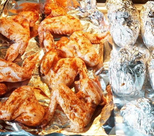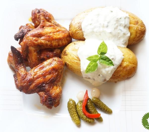 Składniki :7 skrzydełek kurczaka5 dużych ziemniakówmarynata w płynie pikantna Prymatjogurt bałkańskikilka łyżeczek majonezu2 ząbki czosnkupół zielonego ogórkasól, pieprzoregano2 łyżeczki Kucharka smak lata+ ogóreczki z chili SmakPrzygotowanie :Skrzydełka myję. Osuszam. Nacieram marynatą pikantną Prymat. Chowam do lodówki na 2 godziny.Ziemniaki dokładnie szoruję. Posypuję z wierzchu - Kucharkiem smak lata. Folię aluminiową smaruję olejem. Zawijam każdego ziemniaka w folię.Wstawiam do nagrzanego piekarnika do 200 stopni.Po upływie 25 minut. Na blaszce układam skrzydełka i wstawiam na 40 minut. ( czyli ziemniaki ok 65 minut, skrzydełka ok 40 minut).Jogurt bałkański mieszam z majonezem, dodaję czosnek przeciśnięty przez praskę, sól, pieprz i oregano.Ogórka wraz ze skórą ścieram na tarce o grubych oczkach. Czekam chwilę jak puści sok i odsączam.Do sosu z jogurtu dodaję ogórka i dokładnie mieszam.Podaję skrzydełka, ziemniaki nacięte z sosem tzatziki oraz ogóreczki z chili.I gotowe :)