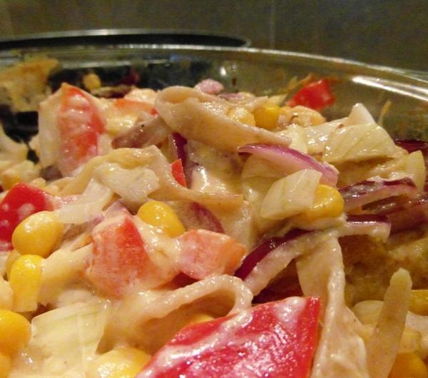 kukurydzę i sos. Przekładamy do żaroodpornego naczynia i posypujemy