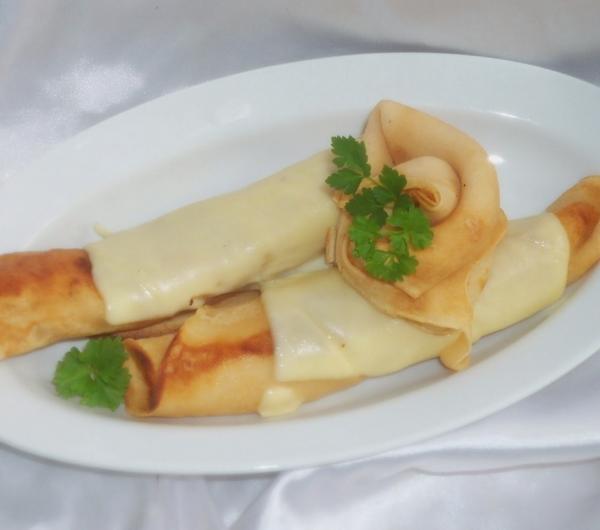Składniki 6 porcji6 naleśników6 plastrów szynki parmeńskiej ( może być inna)6 parówek12 plasterków sera żółtegosos pomidorowy lub keczup.Wykonanie- Na naleśnik rozsmarować trochę sosu pomidorowego , na sos położyć plaster sera żółtego .- Na ser plaster szynki . Na brzegu ułożyć parówkę , zrolować .- Do posmarowanego olejem naczynia żaroodpornego ,ułożyć zwinięte naleśniki . Na każdy położyćplasterek sera . Zapiekać w 220 stopniach do chwili rozpuszczenia sera.Podawać z sosem pomidorowym lub majonezowym . Lub ze swoim ulubionym