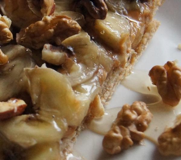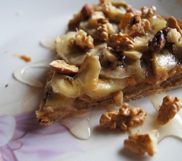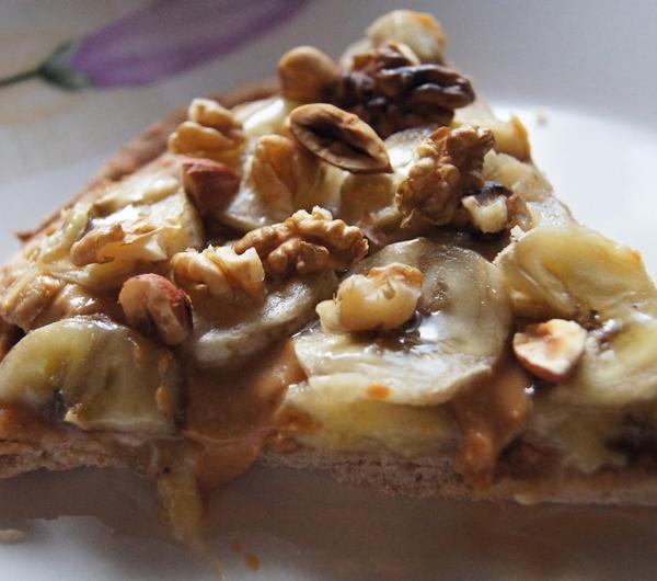 Pamiętam jak parę lat temu będąc z tatą na wycieczce rowerowej wstąpiliśmy na pizzę. Tradycyjnie zamówiliśmy "4 sery", ale potem podczas przeglądania menu rzuciła nam się w oczy jedna, szczególna pozycja- pizza na słodko. Z nutellą, bananami i serkiem mascarpone. Jak moglibyśmy nie spróbować? Potem nikt nie chciał mi wierzyć, że coś takiego istnieje. Więcej! że istnieje i jest pyszne. No "bo jak to? słodka pizza?"A przecież w gruncie rzeczy pizza jest jak naleśniki, dobre zarówno na słodko jak i wytrawnie, bo całość tworzą dodatki. Dlatego ostatnio robiąc swoja domową wersje najpopularniejszego fast-foodu postaniwiłam zrobić ją w tej mniej popularnej,słodkiej odsłonie wykorzystując przy tym najbardziej lubiane przeze mnie składniki- masło orzechowe, banany i orzechy. I jak to się mogło nie udać? ;)Ciasto(na jedną cienką pizzę o średnicy ok.23 cm)-pól szklanki mąki pszennej pełnoziarnistej-pół szklanki maki orkiszowej-szczypta soli-łyżeczka cukru-1/3 opakowania suchych drożdży-łyżka oliwy-1/6 szklanki ciepłej wodySuche składniki(mąki,drożdże,sól i cukier) dokładnie wymieszać i powoli dolewając wody z oliwą zagniatać ciasto. Im dłużej, tym lepiej ja wyrabiałam chyba ponad 10 min. Przykryć i odstawić w ciepłe miejsce do wyrośnięcia na ok.1,5 h.Pozostałe składniki:-3 lub 4 spore łyzki masła orzechowego-2 banany-orzechy włoskie i laskowe(lub inne które lubicie)-miódGdy ciasto wyrośnie, cieńko rozwałkowac je na blaszce( ja uzywałam tortownicy, żeby mieć idealne koło) wyłożonej papierm do pieczenia i lekko natłuszczonej oliwą. Dokładnei posmarowac małsem orzechowym, ułożyc plasterki banana i posypac orzechami. Piec ok. 15 min w piekarniku nagrzanym do 220 stopni(długość pieczenia zależy od grubości pizzy, najlepiej obserwować, kiedy się rumieni). Można polać miodem. Z podanych składników wychodzi 6 średnich kawałków. Może nie są duże, ale nawet jeden wystarczy żeby zaspokic ochote na mało orzechowe( w moim przypadku na krótko ;p)