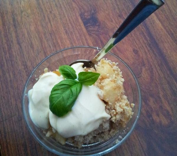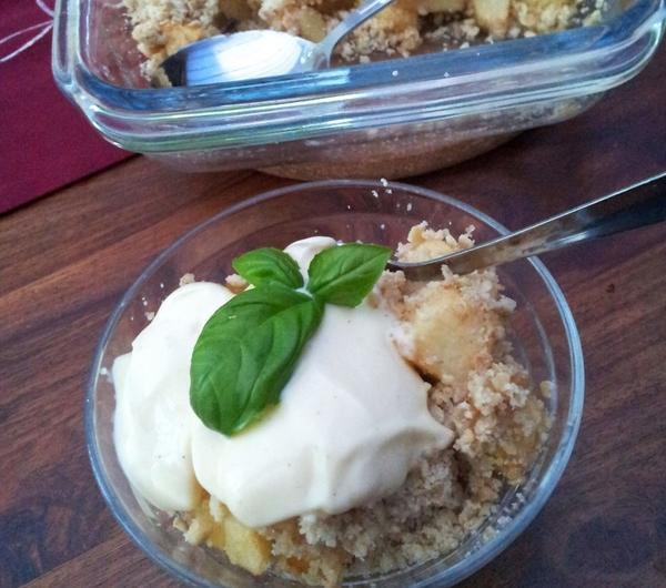 Składniki:5 jabłek (najlepsze zielone, typu antonówka, granny smith)1/2 szkl płatków owsianych1/2 szkl mąki1/2 szkl cukru brązowego2 łyżki masła1/2 łyżeczki cynamonu1/3 łyżeczki gałki muszkatołowejszczypta mielonych goździkówKrem waniliowy:1szkl mleka1szkl śmietany kremówkiziarenka z 1 laski wanilii50g cukru2 żółtka2 płatki żelatynyPrzygotowanie:Jabłka obrać i umyć. Pokroić w grubą kostkę. Posypać cynamonem, gałką i goździkami. Wymieszać.Płatki uprażyć na suchej patelni. Wystudzone wymieszać z mąką i cukrem. Dodać masło i zrobić kruszonkę.W żaroodpornym naczyniu (o wymiarach 15cm 30cm) ułożyć jabłka. Po wierzchu posypać kruszonką.Wstawić do piekarnika nagrzanego do 180 C, i piec przez 20 -25 minut.Z podanej ilości mleka odlać 3-5 łyżek i rozpuścić w nim żelatynę. Pozostałą ilość zagotować wraz z ziarenkami wanilii.Żółtka utrzeć z cukrem. Stopniowo dodawać gorące mleko, stale mieszając. Przelać z powrotem do garnka i nadal podgrzewając, mieszać, aby całość odrobinę zgęstniała ale trzeba pilnować, aby się nie zagotowała. Poziom zgęstnięcia jest ledwo widoczny gołym okiem, nie będzie to konsystencja budyniu, po prostu mleko stanie się bardziej "kremowe". Jeśli zanurzymy łyżkę, to mleko powinno się na nim zatrzymać, a nie spływać lekko jak woda.Śmietanę ubić. Żelatynę (miękką) dodać do mleka z żółtkami i wanilią. Wymieszać, aż się dobrze rozpuści. Wystudzić krem, od czasu do czasu mieszając, aby nie zrobił się kożuch.Chłodny krem wymieszać ze śmietanką.Gorące jabłka z kruszonką udekorować solidną porcją chłodnego kremu.Smacznego :)