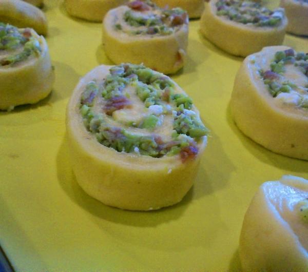 pieprzem.Ciasto ponownie zagniatamy - szybko. Rozwałkowujemy na prostokąt, najlepiej jak najcieńszy (jednak nie na tyle, by zaczął się 'rwać'). Rozkładamy farsz, a następnie zwijamy w roladę wzdłuż krótszego