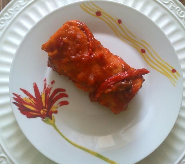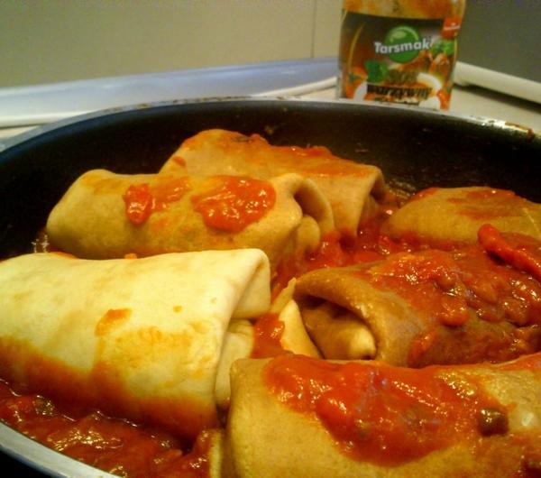 mięso) wlewamy resztę sosu, a na nim układamy zwinięte naleśniki. Przykrywamy pokrywką, dusimy ok. 10 minut. Od czasu do czasu można przewrócić naleśniki na drugą stronę. Smacznego!*skład sosu: