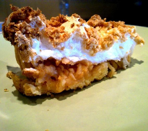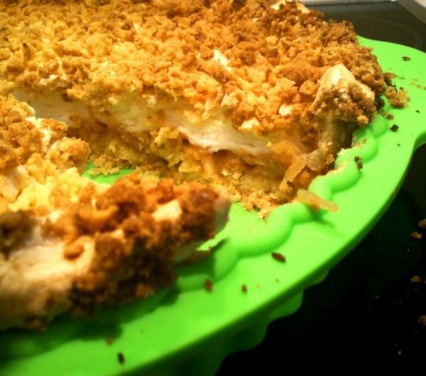 mąkę ziemniaczaną i bardzo delikatnie mieszamy. Gotową pianę układamy na jabłkach. Ostatnią warstwę stanowi pozostałe w lodówce ciasto kruche, które ścieramy na tarce o dużych oczkach bezpośrednio na pianę (równomiernie ją pokrywamy). Gotowe ciasto wkładamy do rozgrzanego do 180 stopni piekarnika i pieczemy 30-40 minut (najlepiej z funkcją termoobiegu). Smacznego!