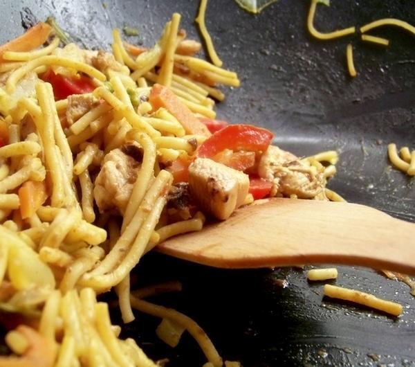 Makaron wyłożyć do dużej miski dokładnie oczyszczając wok z jedzenia (dalej nie zmniejszaj ognia). Wlać pozostały