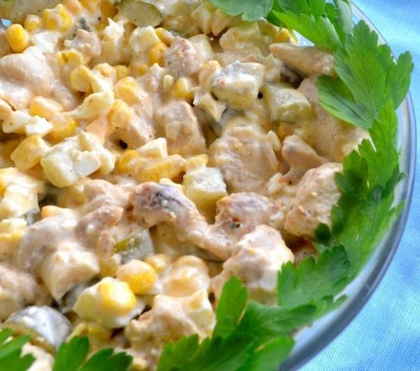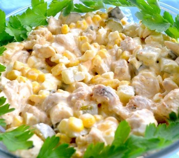 składniki na 4 porcjesłoiczek pieczarek marynowanych 250 gpodwójny filet z piersi kurczaka4 jajkakukurydza z puszki4 małe ogórki konserwowe4 łyżki majonezu2 łyżeczki przyprawy do gyrosa2 łyżki oliwy z oliwekprzepisFileta z kurczaka kroimy na mniejsze cząstki i wrzucamy na rozgrzaną oliwę z oliwek, doprawiamy przyprawą do gyrosa i smażymy aż mięso się zrumieni. Usmażonego fileta odstawiamy z ognia , studzimy i wrzucamy do miski .Następnie w kostkę kroimy ogórka konserwowego, pieczarki przekrawamy na połówki , kukurydzą odsączamy z zalewy.Wszystkie składniki wrzucamy do miski z kurczakiem , dodajemy pokrojone w kostkę jajka a także majonez i całość dokładnie mieszamy .