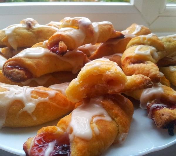 Składniki:kostka masła250 gr twarogu tłustego2 łyżeczki cukru waniliowego1,5 szkl. mąkiSkładniki na polewę:cukier pudersok z cytrynyodrobina śmietany słodkiejSkładniki na lukier dokładnie wymieszać do uzyskania gęstej polewy lukrowejPozostałe składniki :dowolna marmoladamąka do podsypania stolnicyDo miski wsypać mąkę, dodać masło, zagnieść na jednolite ciasto, następnie dodać ser i cukier waniliowy ponownie zagnieść. Ciasto podzielić, rozwałkować na koło, podzielić na części (jak pizze) i na podstawie każdego trójkąta ułożyć po łyżeczce konfitury i zwinąć rogaliki. Piec w rozgrzanym piekarniku 200 stopni C przez 15-20 minut. Jeszcze ciepłe polać lukrem.