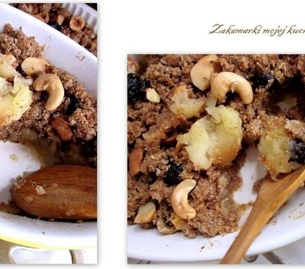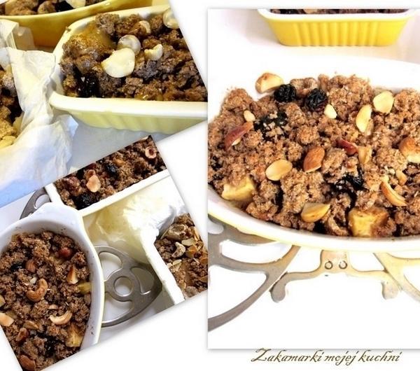 Składniki:ok.1 kg jabłek /najlepsza szara reneta/150 g śliwek suszonych/bez pestek/1 łyżeczka cynamonu2 łyżki cukru/użyłam trzcinowego/50 g granulowanych otrębów pszennychkruszonka:120-150 g miękkiego masła80 g cukru/ użyłam trzcinowego/50 g mąki pszennej/ użyłam razowej/80 g otrębów owsianych80 g otrębów żytnichcukier waniliowyszczypta soli80 g orzechów/mix/Przygotowanie:Rozgrzać piekarnik do temperatury 190°C. Jabłka obrać, i pokroić w ćwiartki, przełożyć do miski, skropić sokiem z cytryny i posypać cukrem i cynamonem. Dodać pokrojone śliwki/jeśli są zbyt suche można je wcześniej namoczyć/ i otręby granulowane, wymieszać . Przygotowaną żaroodporną foremkę do zapiekania posmarować masłem/ewentualnie wyłożyć papierem do pieczenia/ .Można użyć jednej większej foremki lub kilka mniejszych /takich na jeden raz/.Przygotowane jabłka wyłożyć do foremek . W misce zagnieść ze sobą pozostałe składniki, tak aby otrzymać masę o konsystencji kruszonki./dodać połowę orzechów/.I taką właśnie kruszonką posypać owoce.Na wierzch wyłożyć pozostałe orzechy. Piec w rozgrzanym piekarniku/180 st./ około 30-35 min.Najlepszy jest jedzony na ciepło,ale po zimnym też nie zostało śladu....