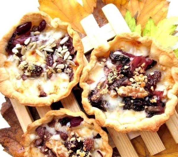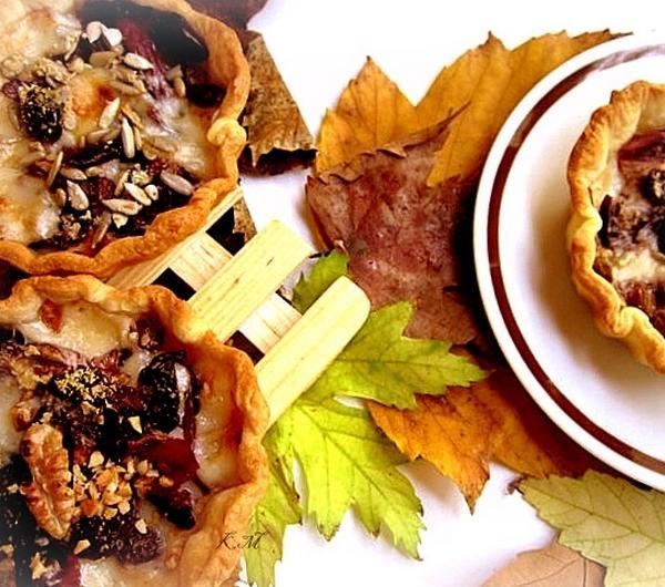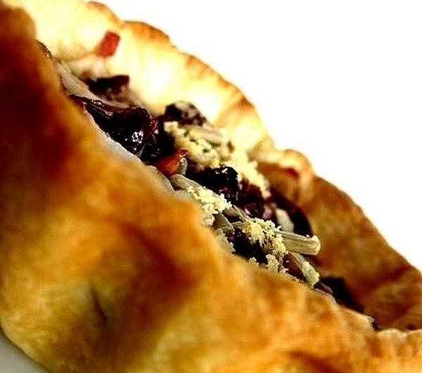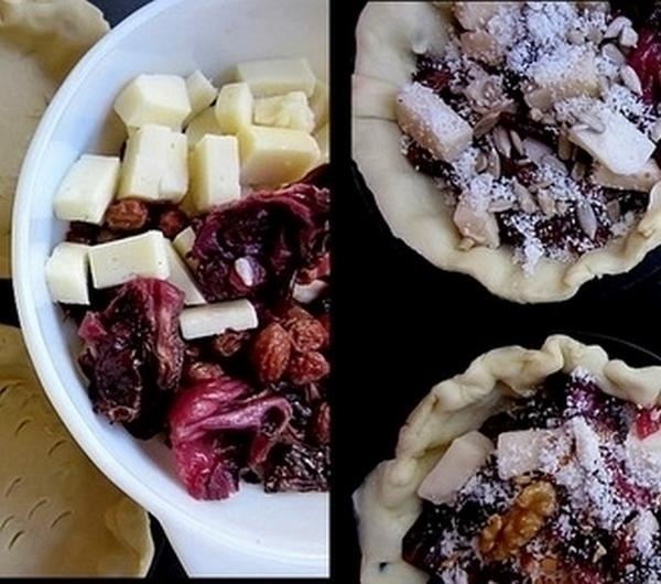 Doskonała przekąska, poczęstunek lub kolacja.Kruche ciasto zapieczone z serowo -warzywnym , słodko- pikantnym farszem smakuję wyśmienicie.Nadzienie można dowolnie komponować w/g własnego smaku , upodobań lub w zależności od tego, co znajdziemy w lodówce. Ale jeśli ktoś nie wie co zrobić z gorzką, czerwoną ,dość twardą sałatą /czyli radicchio/ proponuję właśnie takie tarty.Radicchio /czerwona cykoria/ znane jest jako warzywo dodawane do do świeżej sałaty. Można je znaleźć w gotowych mix-ach sałatkowym. Ale można ją również przygotować na ciepło. Doskonale nadaje się do grillowania, zapiekania w rożnego rodzaju tartach i crostatach , do przygotowania farszu pierogowego . Dzięki zapiekaniu gorzki smak radicchio staje się nieco łagodniejszy i smakuje naprawdę wyśmienicie.Składniki: /6 szt. o śr.ok.10 cm/ciasto:250 g mąki pszennej125 g schłodzonego masła1 żółtko1/2 łyżeczki soli2 łyżki lodowatej wodynadzienie:
