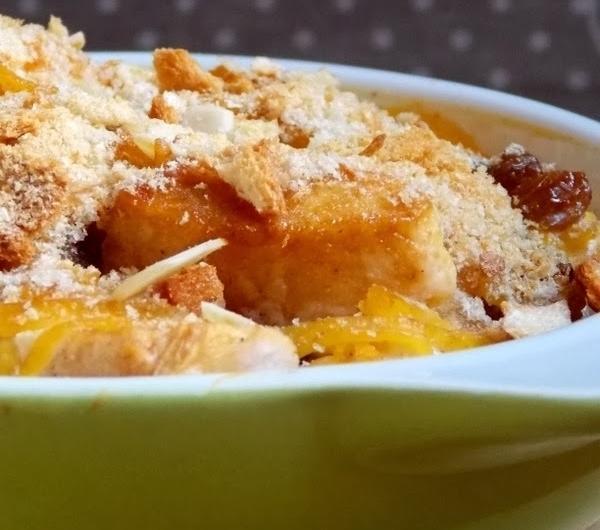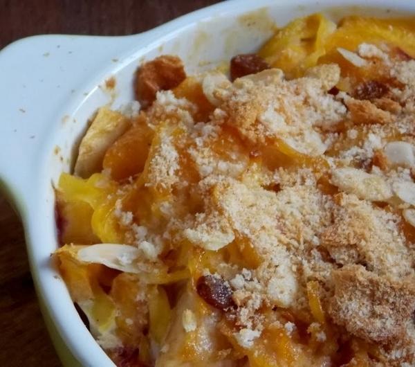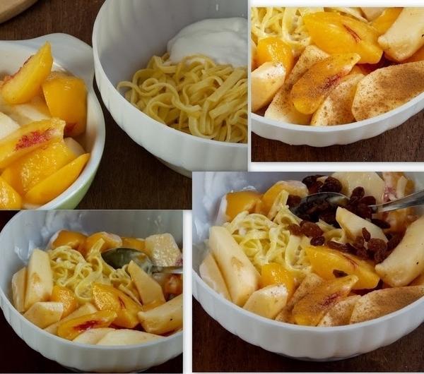 -Jabłka i brzoskwinie umyć, obrać, usunąć gniazda nasienne , pestki ........pokroić w ósemki, skropić sokiem z cytryny.-Makaron ugotować al dente, odcedzić, wymieszać ze śmietaną .-Owoce wymieszać z połową cukru ,makaron z cukrem wanilinowym.-Składniki połączyć /można tę czynność pominąć i układać składniki w naczyniu warstwami/-Dodać cynamon....... rodzynki.-Naczynie do zapiekania starannie posmarować masłem /połową/ , wysypać bułką tartą /połową/.-Wyłożyć masę, docisnąć.-Posypać resztą cukru, bułką tartą i pokryć wiórkami masła.-Posypać płatkami migdałowymi i wstawić do gorącego piekarnika /190- 200 st.C/-Zapiekać ok. 15- 20 minut na złoty kolor.-Podawać na ciepło.