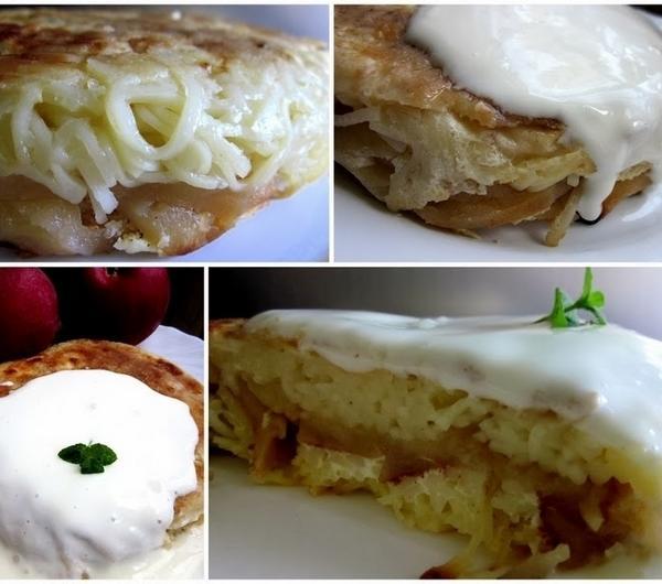 Do zapiekanki z jabłkami doskonale nadaje się również makaron spaghetti.Ugotowany makaron można wymieszać z jajkiem/ ubitym z cukrem/ .Na warstwie makaronu należy ułożyć pokrojone jabłka , posypać je cukrem i cynamonem, a następnie przykryć drugą warstwą makaronu. Wierzch obłożyć wiórkami masła i zapiec.