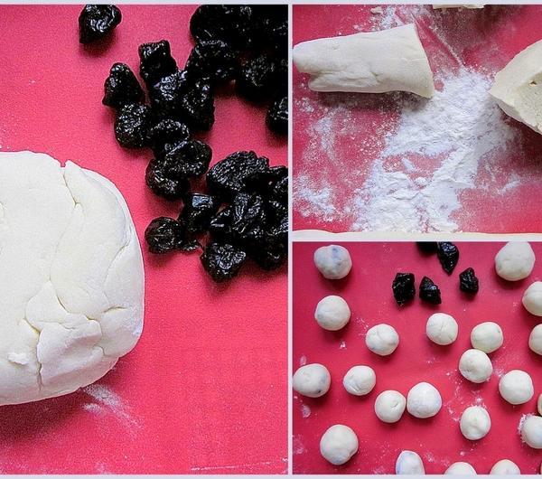 mąką.-Ciasto podzielić na części , uformować w wałeczki i pokroić je na mniejsze części /wielkości piłeczki pimpongowej/-Każdy kawałek spłaszczyć , zrobić wgłębienie , włożyć