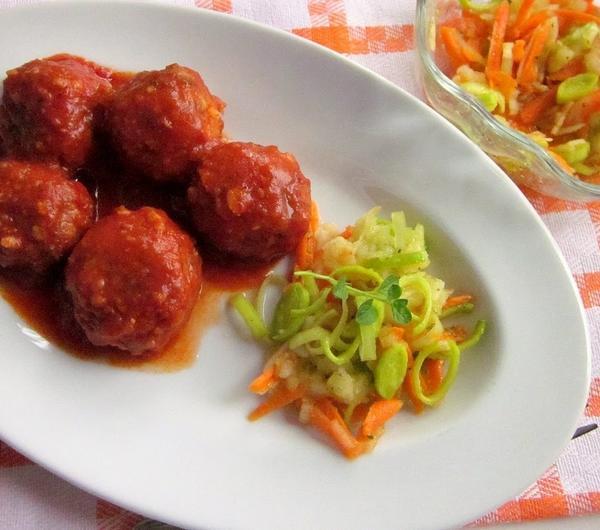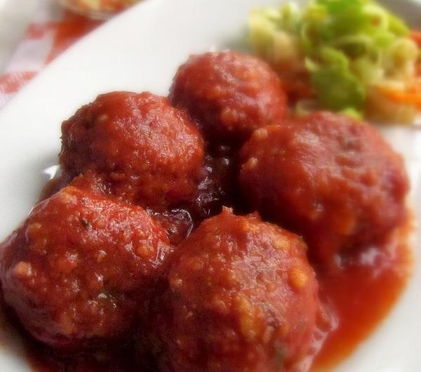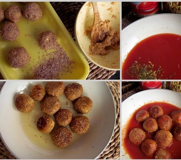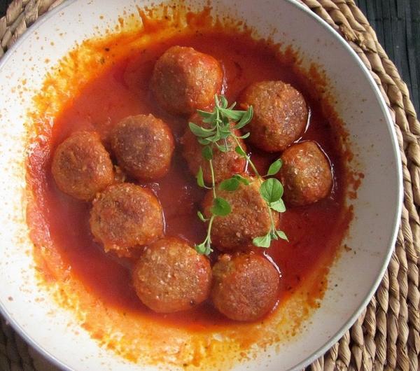 Wykonanie:-Mięso przełożyć do miski.-Wbić jajko, dodać pietruszkę, otręby, doprawić do smaku i starannie wymieszać.-Mięso wstawić na kilkanaście minut do lodówki.W międzyczasie…..-Na głębokiej patelni rozgrzać oliwę, wrzucić czosnek i lekko podsmażyć/ nie przypalić/.- Usunąć czosnek, wlać przecier pomidorowy, ok. 1/2 szklanki wody, wsypać jarzynkę i gotować na małym ogniu przez kilka minut.-Schłodzoną masę mięsną wyjąć z lodówki i uformować z niej małe okrągłe pulpeciki.-Każdą kulkę obtoczyć delikatnie w otrębach.-Smażyć z każdej strony na niewielkiej ilości oleju.-Usmażone pulpeciki odsączyć z tłuszczu i przełożyć do gotującego się sosu.-Gotować przez kilka minut na wolnym ogniu.