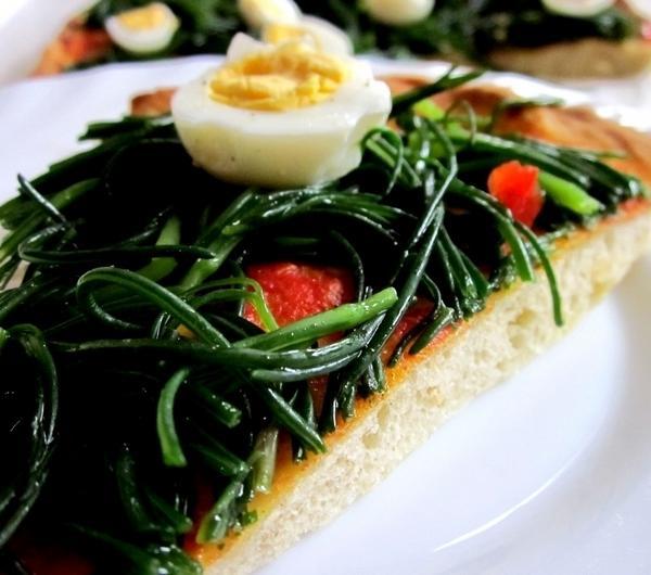 Pizza na spodzie z dodatkiem płatków owsianych to znak, że pora pomyśleć o zdrowszych i trochę lżejszych posiłkach niż miało to miejsce w ostatnich dniach.Jako nadzienie do tej pizzy zużyłam przepiórcze jajeczka, które gdzieś jeszcze się uchowały oraz pyszne , zielone warzywo o nazwie "barba di frate' lub "agretti",które właśnie pojawiło się na ryku/ IT /.