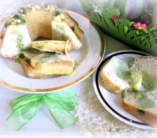 200 g białek (ok. z 5-6 jajek)200 g mąki pszennej3/4 szklanki cukru100 ml mleka1,5 łyżeczki proszku do pieczenia1-2 szklanki oleju arachidowegokilka kropli aromatu cytrynowegoskórka starta z cytrynyszczypta solioraz- 1op. galaretki agrestowej-owoce kandyzowane i plasterki cytryny do dekoracjiPRZYGOTOWANIE:Piekarnik rozgrzać do 170 stopni C.Mąkę połączyć z proszkiem do pieczenia /dobrze jest przesiać ją/Białka ubić na sztywno z odrobiną soli , a pod koniec wraz z cukierem. Ubijając nadal dodawać stopniowo na przemian olej, mleko i mąkę.Ciasto wlać do formy wysmarowanej tłuszczem i wysypanej bułka tartą.Piec w średnio nagrzanym piekarniku ok.45min.Upieczoną babkę pozostawić ok.5 min. w foremce ,a następnie wystudzić ją na kratce.Gotową babkę można posypać cukrem pudrem lub polać ulubioną polewą.