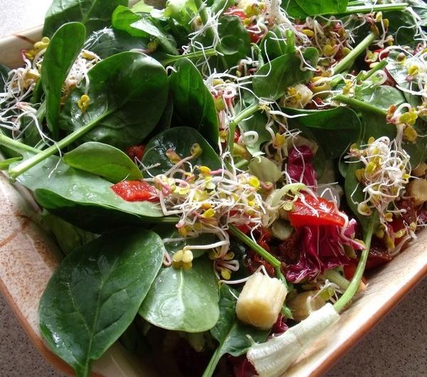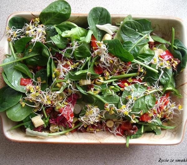 Bomba witaminowa, czyli świeży szpinak, roszponka, papryka, migdały, kurczak i kiełki w pysznej sałatce