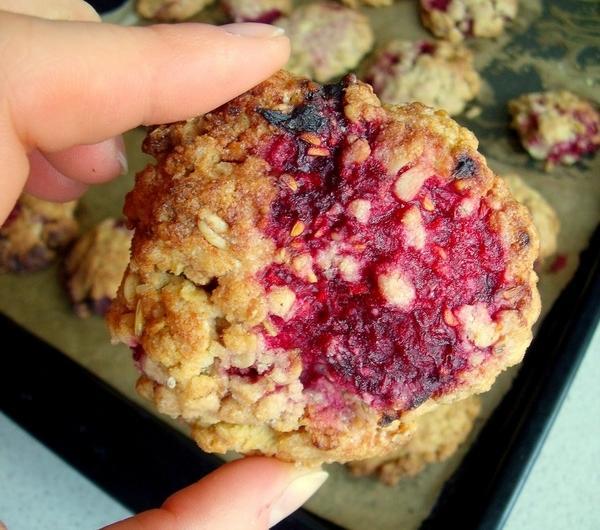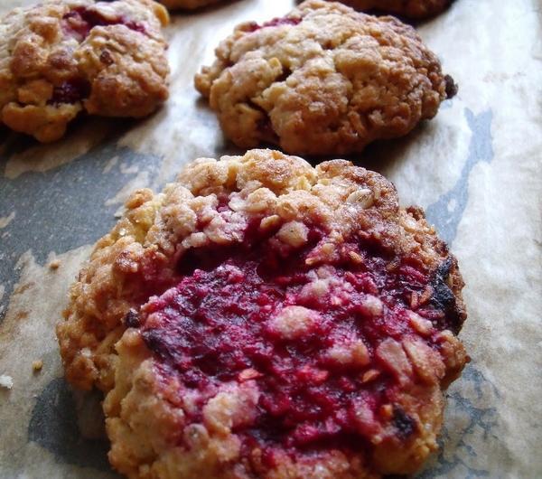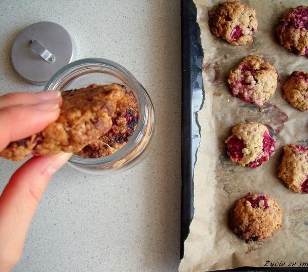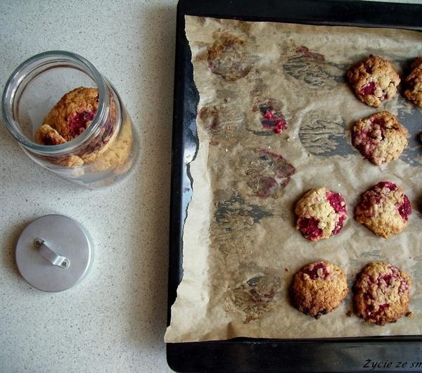maliny i delikatnie mieszamy.Blachę wykładamy papierem do pieczenia. Wykładamy po czubatej łyżce ciasta, można formować kulki i delikatnie spłaszczyć.Pieczemy w 170-180 stopniach przez 20-25 min lub do momentu zarumienienia