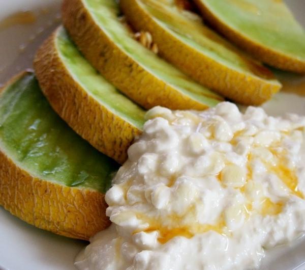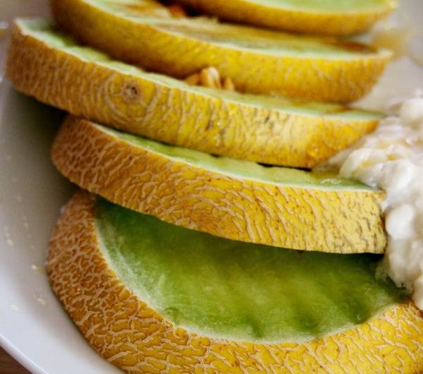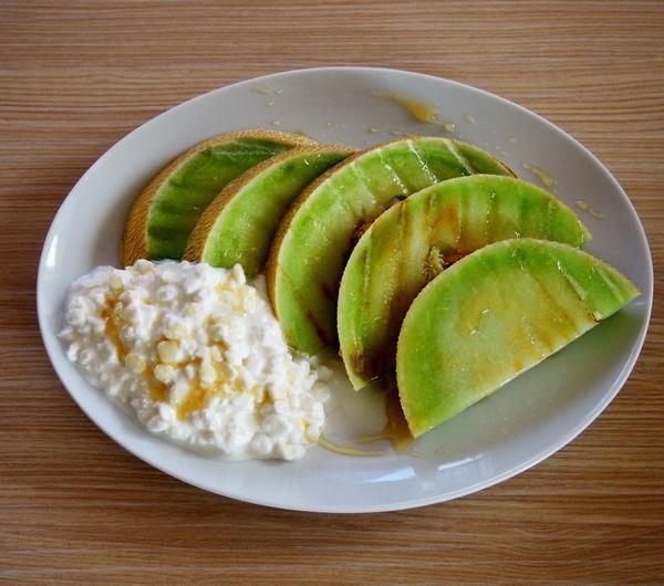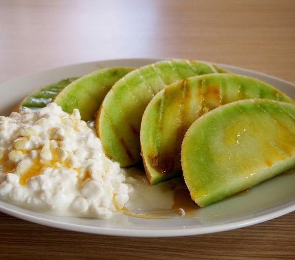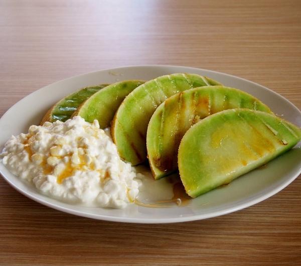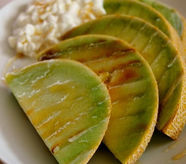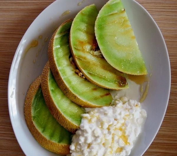 mioduMelona pokroić w grube plastry - nie obierać ze skórki, ułatwi to grillowanie i późniejsze jedzenie. Grillować przez kilka minut z obu stron. Podawać z