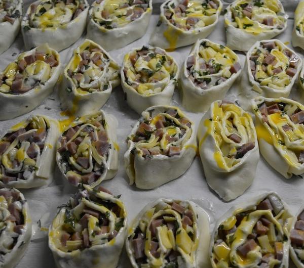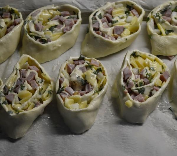 Szynkę, ser żółty i cebulę pokroić w drobną kostkę. Jeżeli ma być dodany szczypiorek, również drobno go pokroić natomiast pietruszkę posiekać. Wszystko wymieszać razem z białkiem, śmietaną oraz przyprawami. Ciasto francuskie rozwinąć na papierze do pieczenia, wyłożyć farsz i zawinąć w rulon.
