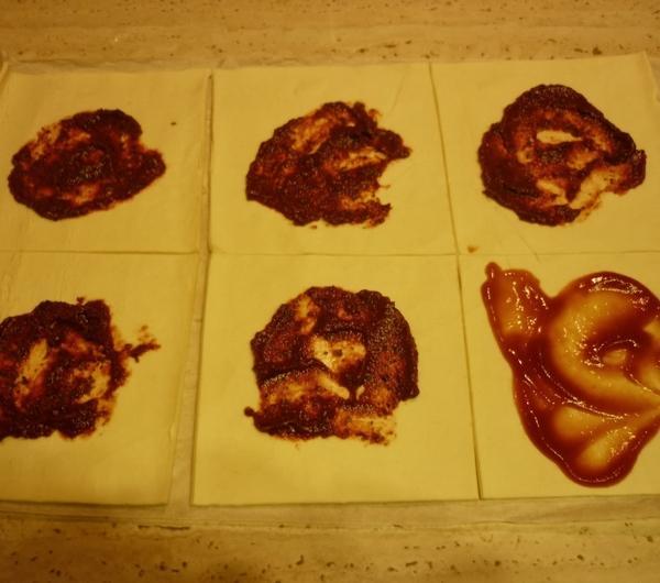 ketchup ma ułatwione zadanie ;)Przygotowaną miksturę kładziemy na cieście (ost. kwadrat to