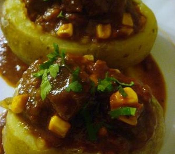 ziemniakom odcinamy górę i łyżeczką drążymy środek tak by powstała "miseczka" a następnie wypełniamy je gotowym mięskiem,dekorujemy posiekaną