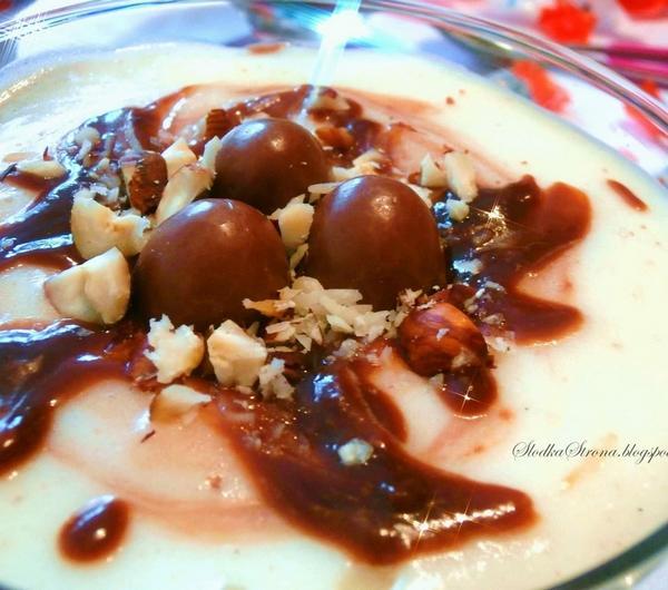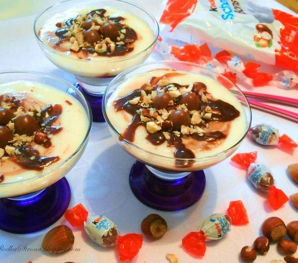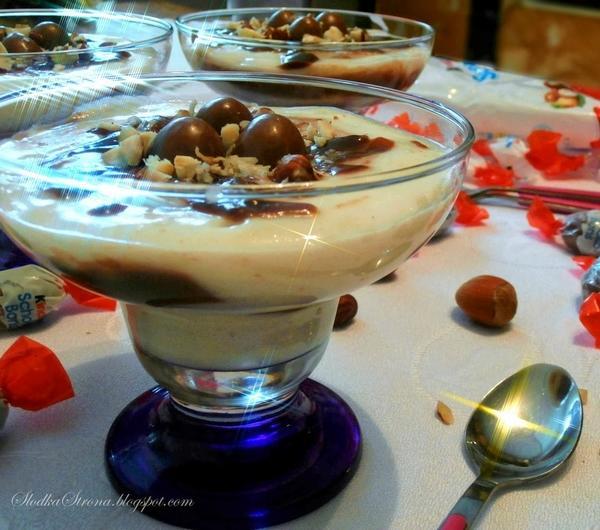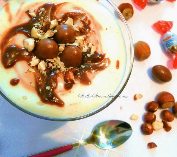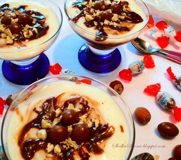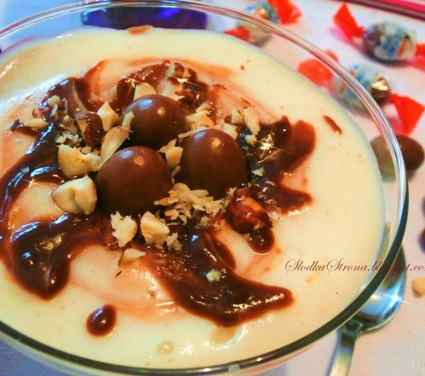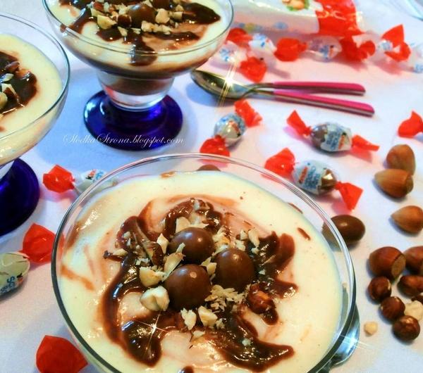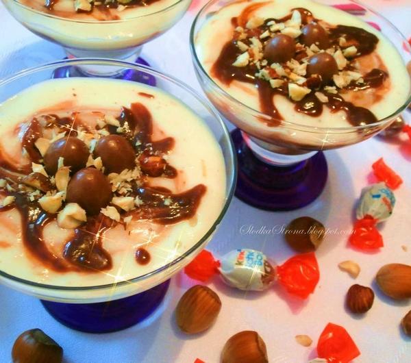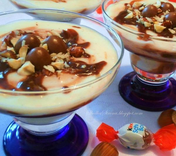 Orzechy laskowe, czekolada, kaszka manna i Schoko Bons. Tworząc ten deser wiedziałam, że będzie dobry, ale efekt przeszedł wszelkie moje oczekiwania. Jest to jeden z najlepszych deserów jakie jadłam, mimo, że jest taki prosty w wykonaniu. Polecam wypróbować, bo naprawdę warto.