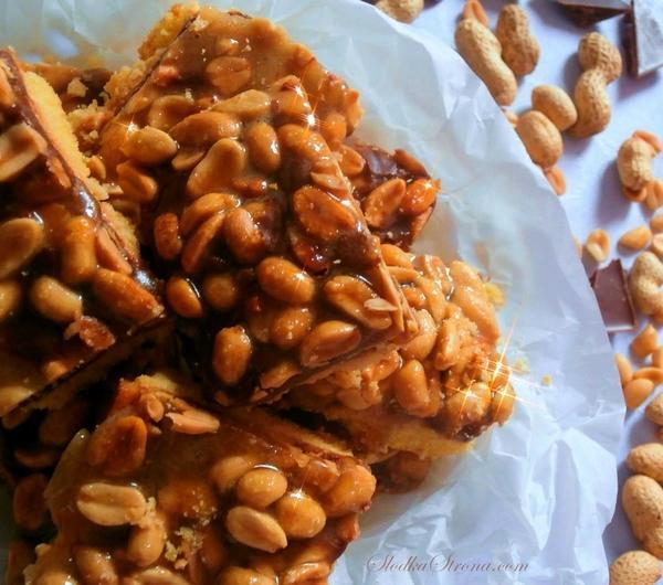 Z podanych składników zagniatamy ciasto i umieszczamy w lodówce na ok. 30 minut. Po tym czasie formę o wielkości ok. 20 x 28 cm smarujemy tłuszczem i wykładamy ciastem. Nakłuwamy widelcem.Pieczemy w temperaturze 180 stopni ok. 20 minut.Na ostudzone ciasto wykładamy masło orzechowe i rozsmarowujemy po całej powierzchni mazurka.W kąpieli wodnej rozpuszczamy masło wraz z połamaną czekoladą i przygotowaną polewę rozprowadzamy na cieście - studzimy.W garnku, na małym ogniu podgrzewamy miód wraz z cukrem co całkowitego rozpuszczenia. Następnie ściągamy z ognia, dodajemy łyżeczkę margaryny, szczyptę sody i energicznie mieszamy. Do karmelu wrzucamy orzeszki ziemne i dokładnie mieszamy. Orzeszki w karmelu wykładamy na wierzch mazurka i odkładamy do zastygnięcia (czynność tę wykonujemy dość szybko, ponieważ karmel szybko zastyga).Mazurek kroimy na niewielkie kwadraty (najlepiej minimum dzień po upieczeniu).