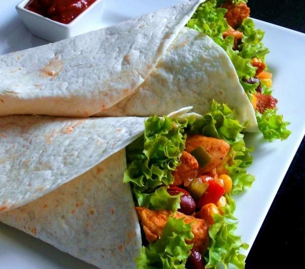 ok. 120 g kukurydzy z puszkiok. 120 g fasoli czerwonej z puszkiok. 300 g papryki czerwonej (lub mix papryk: zielona, żółta, zielona)olejsałata (opcjonalnie)sos meksykański (przepis) lub chiliKurczaka kroimy w pasy, dodajemy ok 2 łyżki oleju, łyżkę przyprawy do kurczaka, odrobinę chili i po szczypcie reszty przypraw. Mięso smażymy na rozgrzanym oleju z obu stron.W tym samym czasie kroimy cebulę i czosnek w drobną kostkę i podsmażamy na niewielkiej ilości oleju. Następnie dodajemy drobno pokrojoną paprykę, a gdy lekko zmięknie wrzucamy kukurydzę oraz czerwoną fasolę. Chwilę podgrzewamy.Każdą tortillę smarujemy sosem meksykańskim lub chili, wykładamy warzywa, kawałki kurczaka i zwijamy w rożek (można spiąć wykałaczkami).