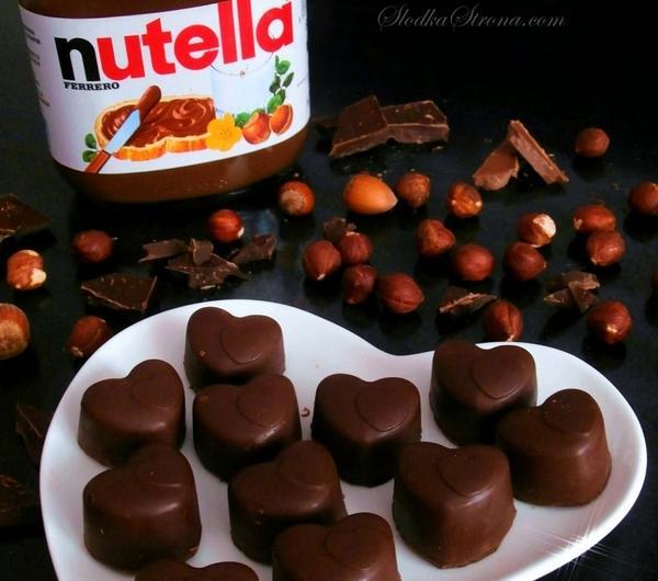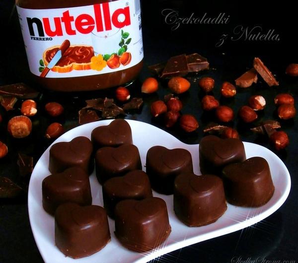 Czekoladę rozpuszczamy w kąpieli wodnej. Czekoladą smarujemy foremki na czekoladki (cienką warstwą np. za pomocą pędzelka)*. Formę umieszczamy w zamrażalniku na ok. 10-15 minut. Następnie smarujemy drugą warstwą czekolady i znów wkładamy do zamrażalnika na kolejne 10-15 minut. W razie konieczności czynność powtórzyć. Następnie do foremek wykładamy porcje Nutelli, zostawiając miejsce na zalanie czekoladą**. Znów wkładamy do lodówki na ok. 10 minut. Po tym czasie roztopioną czekoladę wlewamy do foremek i wygładzamy za pomocą noża lub szpatułki. Odstawiamy do zastygnięcia.Gotowe czekoladki ostrożnie wyjmujemy z formy silikonowej.*foremki możemy posmarować bardzo cienką warstwą oleju - wtedy łatwiej odejdą od formy**w czekoladkach możemy dodatkowo umieścić całe orzechy laskowe