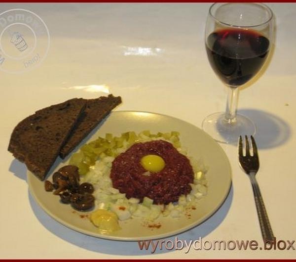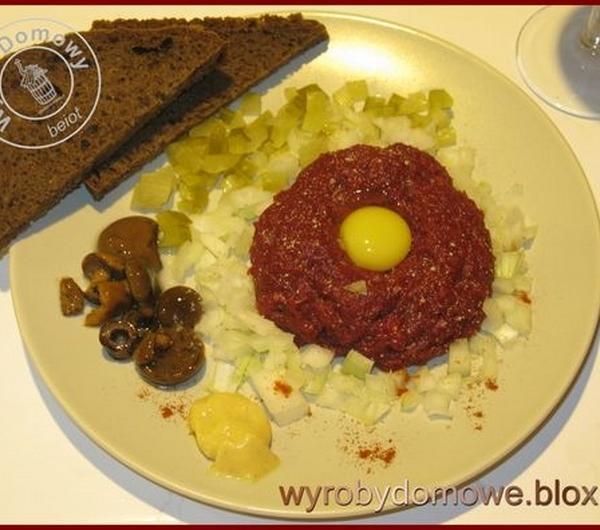 Mięsko wstępnie przyprawiamy solą, pieprzem i papryką, dolewając odrobinę oliwy, a następnie wyrabiamy masę. Z masy robimy kuleczki, które spłaszczmy i robimy dołek na żółtko.Układamy na talerzyku. Do każdej porcji mięsa na talerzu podajemy drobno posiekane ogórki kiszone i dużo cebulki białej oraz nie powinno zabraknąć grzybków. Należy również podać do tego musztardę, sos sojowy oraz do wyboru pieprz i tabasco.Tatar według upodobań można jeść z grzankami posmarowanymi masłem od krówki lub chlebem, jak kto woli. Można też spożywać bez pieczywa z kieliszkiem wytrawnego czerwonego wina albo nalewki myśliwego.
