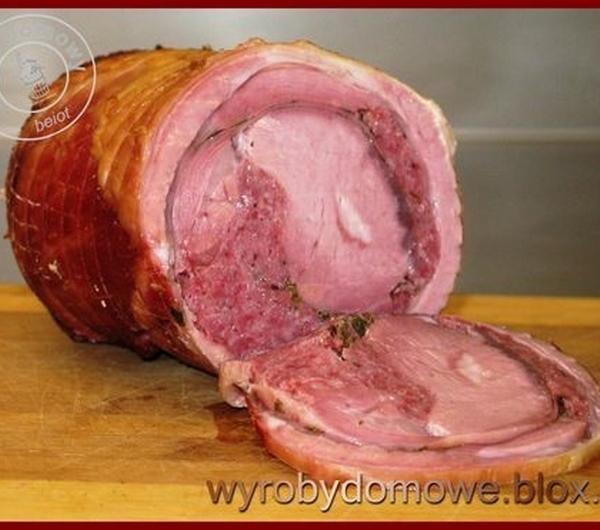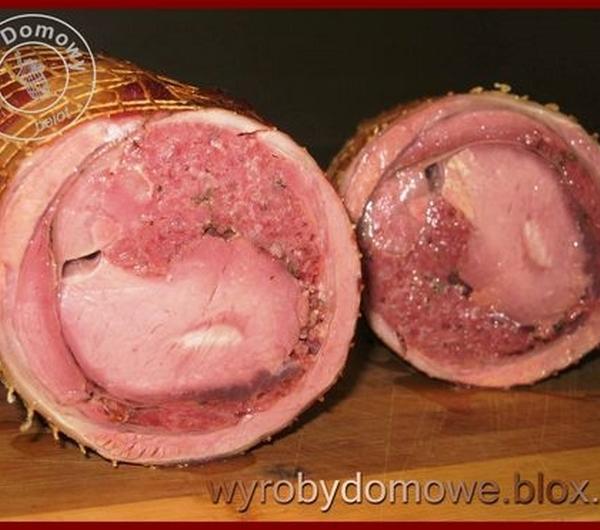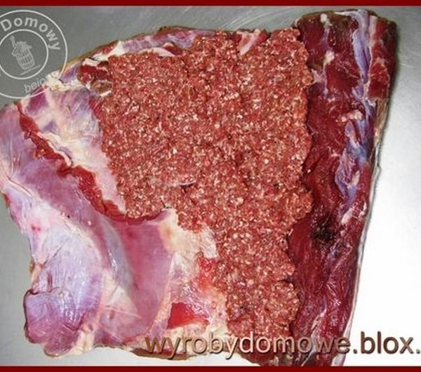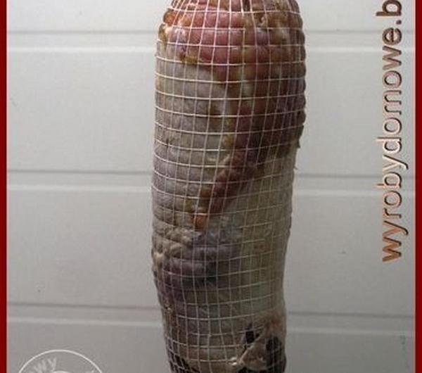 Rolujemy, zwijamy i sznurujemy lub wkładamy do siatki wędzarniczej tak aby mięsień grzbietuwy był wewnątrz rolady.