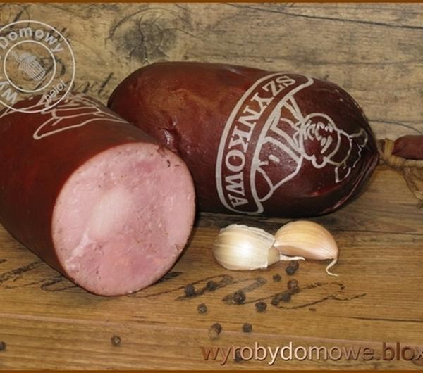 Składniki:- wieprzowina kl. I 8kg- wieprzowina kl. III 2kg- cukier 2g/kg- pieprz naturalny 1,5g/kg- gałka muszkatołowa 0,2g/kg- kolendra mielona 0,2g/kg- osłonki białkowe 90mmMięso sklasyfikowane i pokrojone w kostkę peklujemy na sucho 48h (17-20g peklosoli na kg mięsa).Mięso kl. I kroimy w kostkę ok. 4x4cm. Wieprzowinę kl. III rozdrabniamy na sitku 2mm i następnie kutrujemy z dodatkiem wody lub lodu 20-25% i przypraw. Temp. kutrowanej masy max. 15 stopni.Mięso kl. I mieszamy dokładnie, aż zacznie się kleić. Można do tego użyć maszyny do wyrabiania chleba lub mieszałki, albo pracować dłońmi. Po uzyskaniu kleistości dodajemy wykurowaną masę i mieszamy dokładnie. Równomiernie wymieszaną masą napełniamy ściśle osłonki, wiążemy końce nićmi, sporządzamy pętelkę do zawieszenia. Długość batonu 40-45cm.Osadzamy w temp. 2-6 stopni ok. 12h. W pomieszczeniu nie chłodzonym 2-3h.Wędzimy dymem gorącym temp. 45-80 stopni ok. 130-150min do osiągnięcia jasnobrązowej barwy.Parzymy w temp. 72-75 stopnie przez 80-110min do osiągnięcia wewnątrz batonu temp. 68-70 stopni.Studzimy po spłukaniu gorącą wodą w pomieszczeniu chłodzonym do temp. ok. 18 stopni.Powtórnie wędzimy zimnym dymem ok. 12h lub dymem ciepłym ok. 6h do uzyskania barwy ciemno brązowej.Chłodzimy w pomieszczaniu do temp. 5-12 stopni.Wydajność średnia 90%.Smacznegoniedziela, 10 lutego 2013, beiotpoleć znajomemu » śledź komentarze (rss) »TrackBackKomentarzeOstatnie wpisyMielonka z dziczyzny – ...Peklowanie zalewowePeklowanie suche, soleniePolędwiczki z warchlakaPolędwica i szynka z jeleniaChlebek orkiszowy WiesławaMój prezent gwiazdkowy 2015Pasztet myśliwegoRosół z kaczkiDzika kaczka wędzona_________________________ ____________________________________________________ __________________________ Licznik gości ____________________________ On-line: _________________________Smaczne Zdrowe Wyroby DomoweWypromuj również swoją stronę ____________________________________________________ __________________________ __________________________ __________________________ __________________________ Zdjęcia i teksty na tej stronie są mojego autorstwa i zabrania się ich kopiowania, powielania i wykorzystywania do celów komercyjnych bez mojej zgody!!! Wykorzystanie przepisów oraz instrukcji mojego autorstwa znajdujących się na tym blogu w celach komercyjnych wymaga zgody autora!!!design by SenTineL Wood.nPisz blogzamów newsletter
