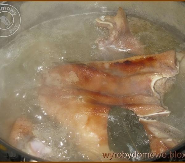 Do garnka wlewamy wodę, wkładamy mięso i warzywa oraz przyprawy, tak jak do rosołu. Cebulę kroimy na połówki i opiekamy na ogniu, na czarno.