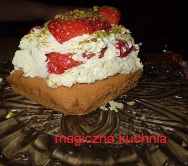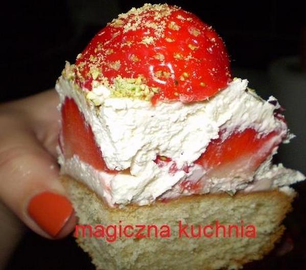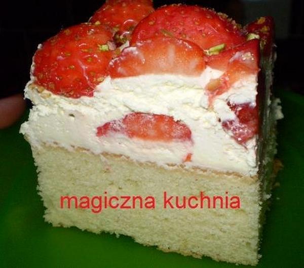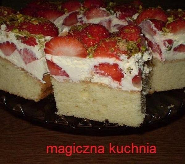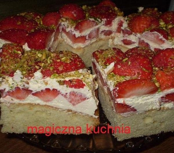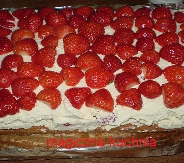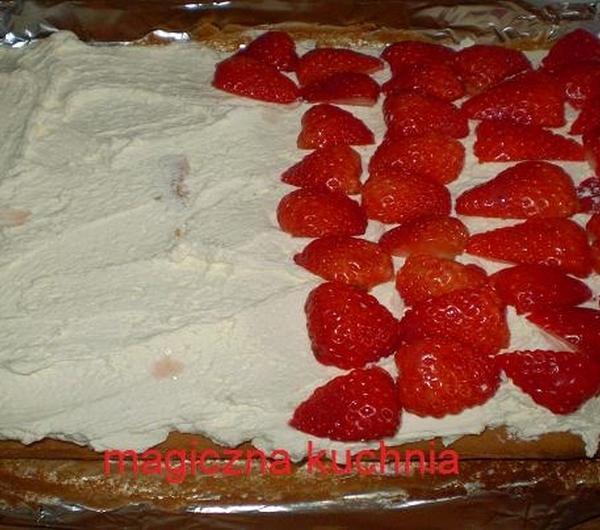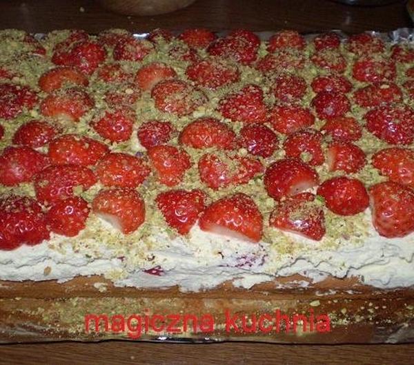 truskawkowe połówki na wierzchu................................................Całe ciasto posypujemy zmielonymi