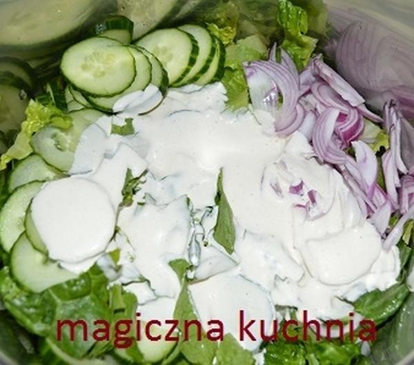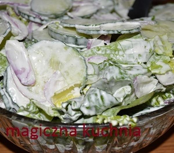 Szybka i bardzo prosta, sałatka idealna na letnie gorące dni. Można ja zajadać samą lub używać jako dodatek do pieczonych lub grillowanych potraw.Składniki:1 duży zielony ogórek1 główka sałaty rzymskiej1 czerwona cebula lub por1 szklanka sosu czosnkowego, przepis na sos znajdziecie tutajOgórka i sałatę dokładnie płuczemy pod bieżącą zimną woda. Sałatę osuszamy i rwiemy na kawałki do miski, następnie dodajemy do niej pokrojonego w plasterki zielonego ogórka i poszatkowaną w piórka czerwoną cebulę.Na końcu do sałatki dodajemy sos czosnkowy.Sałatkę dokładnie mieszamy i jeśli jest taka potrzeba to doprawiamy solą i pieprzem, ale pamiętajcie że sos jest już doprawiony i przed dodaniem przypraw najpierw spróbujcie sałatkę. Smacznego !!!