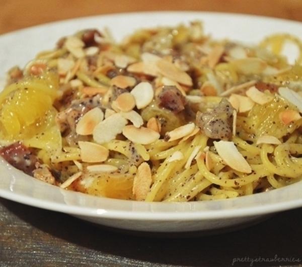 płatkami migdałowymicorn pasta with poppy seed-gingerbread sauce with dried apricots, dates, orange peel and lemon, walnuts, orange and toasted almond flakes