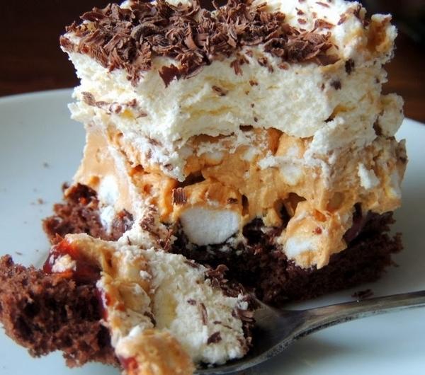 Biszkopt:4 jajka1/3 szklanki ciemnego kakao1/3 szklanki mąki1/2 szklanki maki260g powideł do posmarowania biszkoptu wymieszane z 4 łyżkami soku z cytrynyKrem:puszka mleka skondensowanego słodzonego ( gotowana 3 godziny ) lub gotowej masy kajmakowej200g masła20 szt malutkich bezBita śmietana:800ml śmietany kremówki2 łyżki cukru pudru3 łyżki soku z cytrynyDo nasączenia ciasta: 4 łyżki soku z cytryny+ 4 łyżki czarnej herbatyNa wierzch do posypania: ok 40g gorzkiej czekoladyPrzygotowanie:Piekarnik nagrzać do 170 stopni ( góra dół bez termoobiegu). foremkę wysmarować masłem wyłożyć papierem do pieczenia.Żółtka oddzielić od białek, białka ubijać ns srednich obrotach do czasu aż się spienią.Zwiększyć obroty i cały czas ubijając dodawać po łyżce cukru.Ubijać aż białka będą sztymne i lśniące. Następnie dodawać po jednym żółtku, ubijać aż masa bedzie puszysta.Mąkę przesiać z kakao. Dodawać do masy z białek delikatnie mieszając aby piana nie opadała.Wyłożyć na blaszkę, piec przez około 20 minut. Po upieczeniu ciasto od razu wyjąć z piekarnika, wystudzić.Wystudzone ciasto skropić nasączeniem i posmarować powidłami.Krem:Masło utrzeć mikserem na puch, zmniejszyć obroty do minimum i dodawać po łyżce masy kajmakowej. Kiedy składniki będą połączone w jednolity krem pokruszyć bezy i dodać do masy, wymieszać.Gotowy krem wyłożyć na biszkopt wysmarowany powidłami.Bita śmietana:Zimną śmietanę ubić na sztywno z cukrem pudrem. Wyłożyć na masę kajmakową z bezą.Gorzką czekoladę zetrzeć na tarce, posypać ciasto.Ciasto przechowywać w lodówce.Smacznego :)