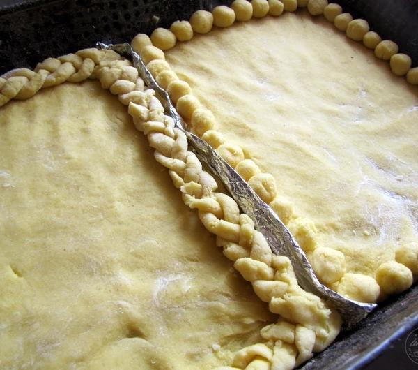 Składniki ciasta zagnieść i schłodzić w lodówce. Przygotować dużą blaszkę, ciasto podzielić na pół i z kazdej odkroić ok 1/5 na waleczek dookoła.Ciasto rozwałkować na prostokąty, kwadraty czy koła, do reszty ciasta dodać ok 2 łyżki