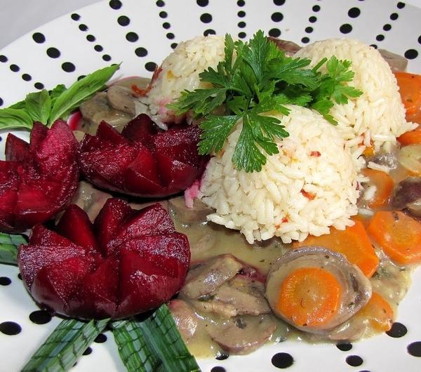 na ryż1 szkl ryżu2 szkl wody1 łyżeczka suszonych pomidorów1 łyżka olejuszczypta sol i na buraczki5-6 szt buraczków ćwikłowych małychpół szk czerwonego winapół szkl cukruSerca oczyścić, wymoczyć i zalać czystą wodą tak by pływały. Dodać pokrojoną drobno cebulę i marchewkę w całości, doprawić solą i majerankiem i jarzynką, ugotować do miękkości. Buraczki umyć, zalać wodą i ugotować. Ryż ugotować z dodatkiem soli, pieprzu i suszonych pomidorów. Pozostawić pod przykryciem. Serca wyjąć z bulionu łyżką cedzakową, marchewkę również i pokroić na plasterki. Wrzucić ponownie do bulionu. Dodać posiekany czosnek i gotować odparowując nadmiar płynu. Pod koniec podprawić mąką rozrobioną w malej ilości wody. Ugotowane buraczki obrać i przekroić dekoracyjnie lub na zwykłe plastry. Na patelni zagotować wino z cukrem aż wytworzy się syrop. Dodać buraczki i obracać je gotując ok 5-7 min. Na talerzu nakładać porcje gulaszu z serc, na nie kulki ryżu i obok buraczki polane dodatkowo glazurą.