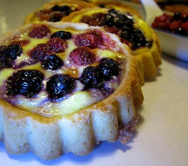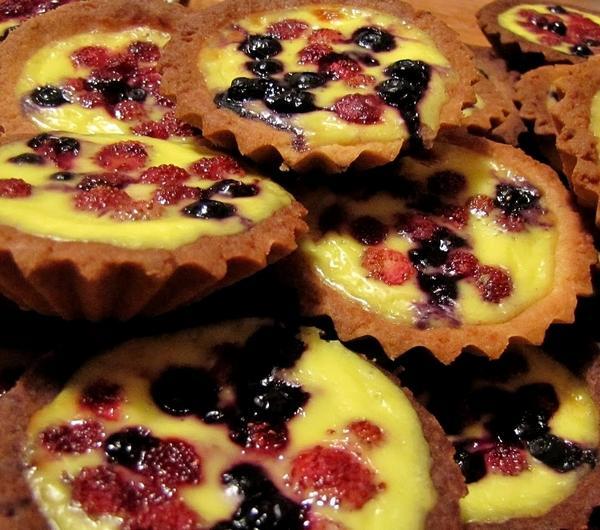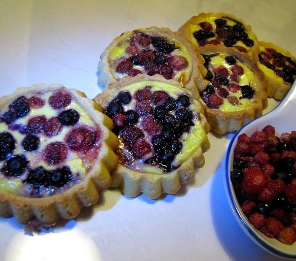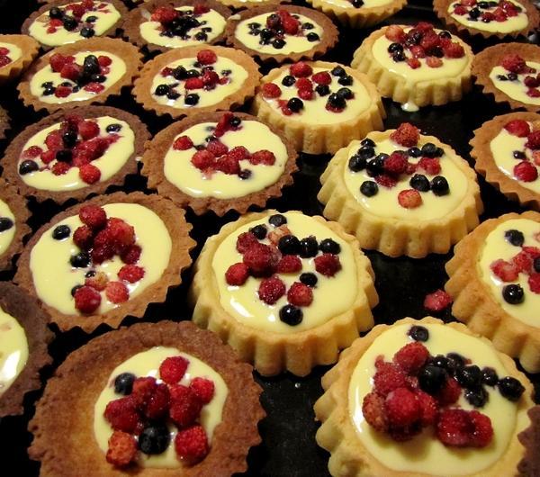 500 g mąki125 g margaryny125 g smalcu125 g cukru pudru6 żółtekaromat śmietankowynadzienie2 serki waniliowe2 żółtkaowoce leśne mrożone ; poziomki, jagodyMąkę przesiać, dodać margarynę i smalec oraz resztę składników. Dobrze wszystko rozetrzeć i zgnieść na jednolite plastyczne ciasto.Wylepić foremki na tartaletki lub babeczki. Upiec a złoty kolor.Ciasteczka wyjąć z foremek.Serek wymieszać z żółtkami, wlać łyżeczką do każdego ciasteczka porcję kremu i posypać rozmrożonymi lekko owocami, można je odrobiną zaspać cukrem.Ciasteczka zapiec.